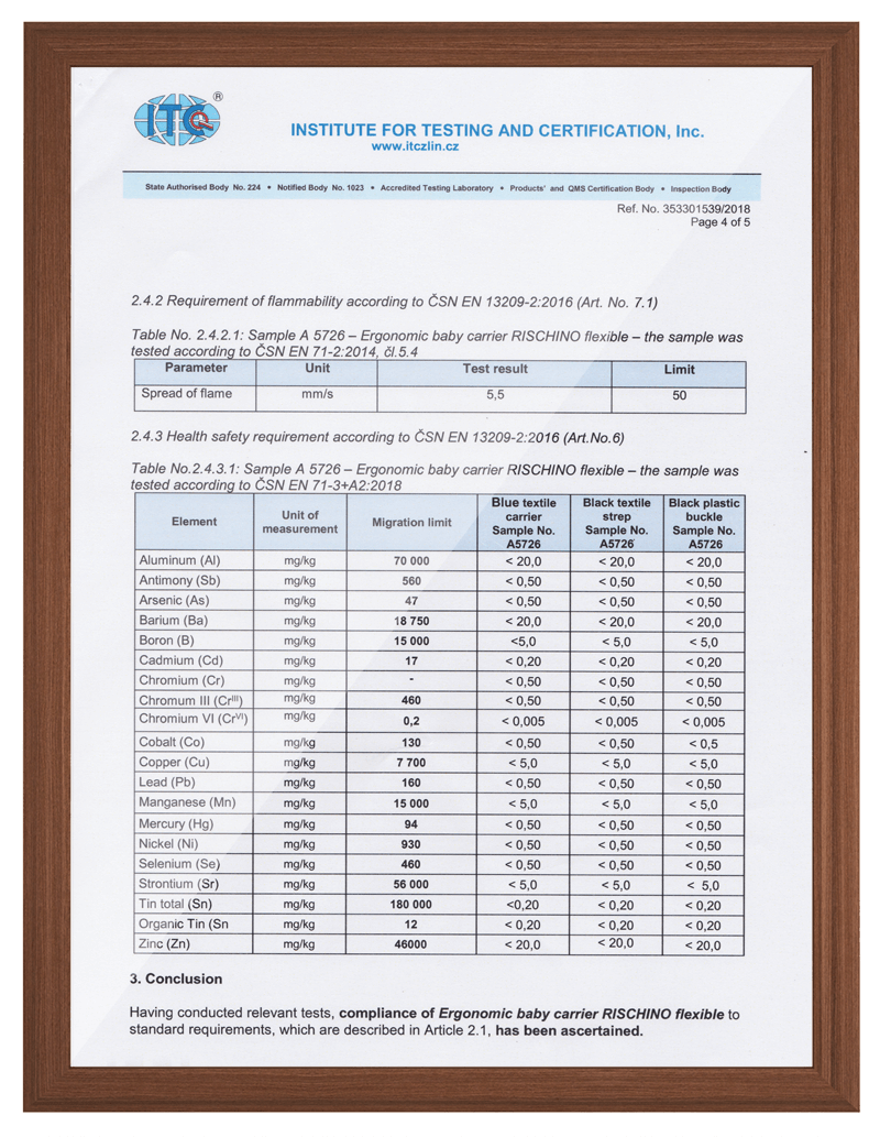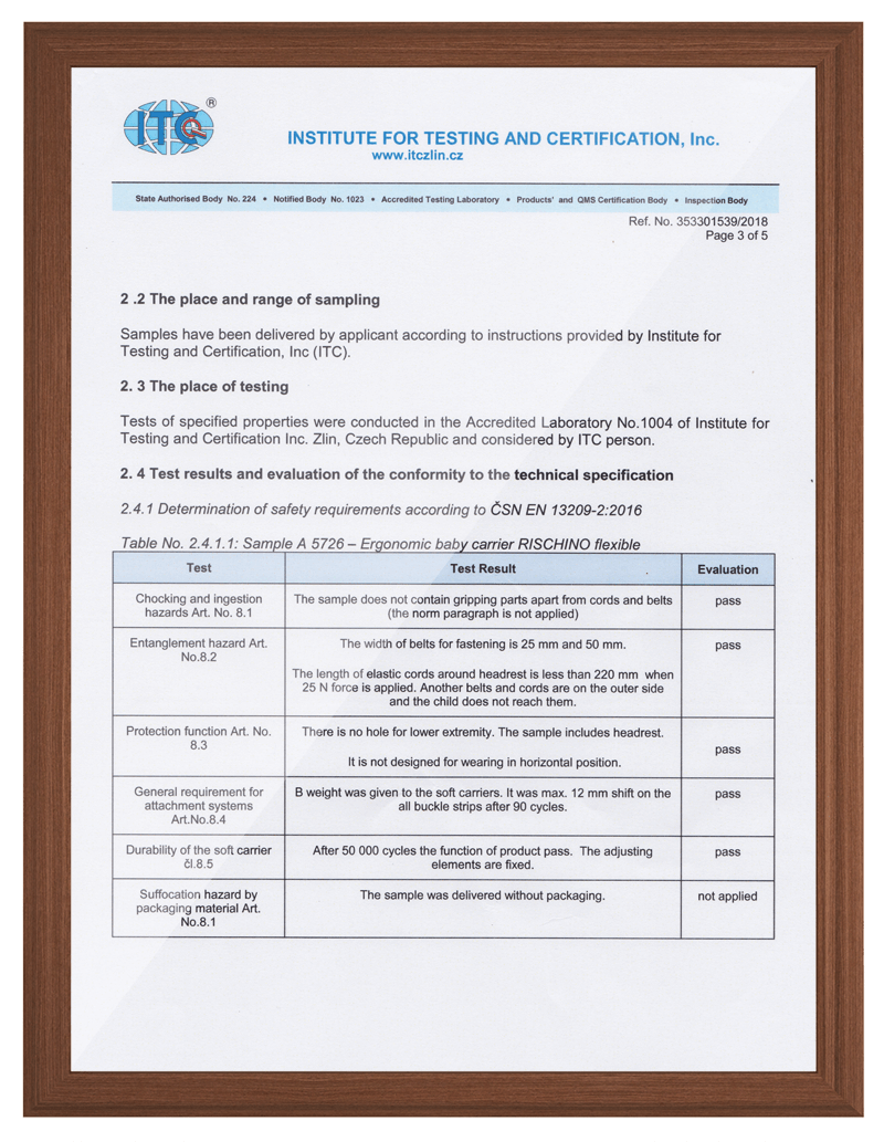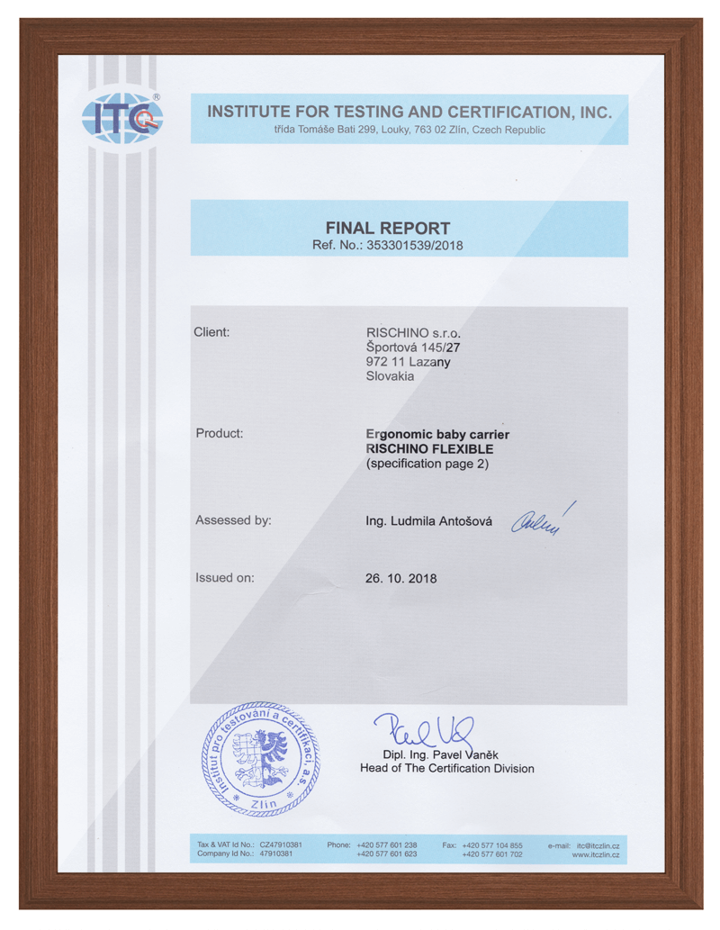 Nosítko máme certifikováno jako celek, který splňuje a navíc převyšuje evropskou normu. Také máme certifikáty i od každého komponentu zvlášť. V této sekci najdete certifikáty na naše popruhy, spony, česanou organickou bavlnu, nitě a certifikáty kvality výrobku. Jelikož byly naše ergonomické nosítka jedinečně navrženy ve spolupráci s lékaři a certifikovanými poradkyněmi nošení, najdete zde i ochrannou známku.